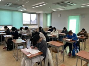 休み時間には、友達と問題を出し合ったり、対策プリントを広げて最終確認をしたりと、教室には心地よい緊張感が漂っていました。いざテストが始まると、教室内は静まり返り、生徒たちは真剣な表情で問題用紙に向き合っていました。これまでの授業や家庭学習の成果を発揮しようと、一問一問丁寧に取り組む姿が印象的でした。